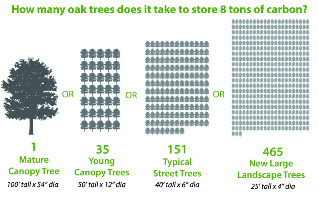 Eventually, woodlands will reach a point where they no longer accumulate more carbon, entering a “steady state” where carbon gained from photosynthesis equals carbon lost through respiration. Because it can take decades to at least a century for most trees to reach this steady state, and because it takes decades to hundreds of years for mature tree biomass to be replaced by newly planted saplings or requires planting of hundreds of landscape-sized saplings, mature trees and established woodlands should be prioritized for protection.